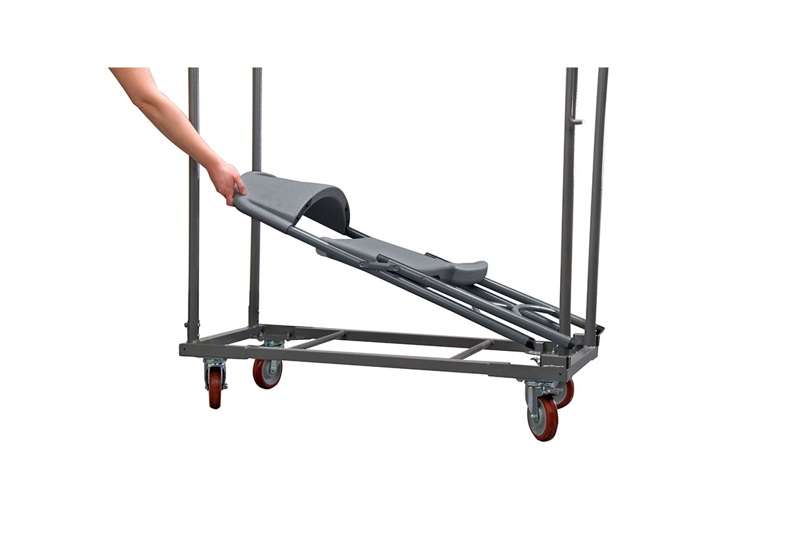 Kolica za prevoz sklopivih stolica Aran, Aran Trolley. Okvir kolica je metalni, djelomično sklopiv, točkovi sa stopama. Težina praznih kolica je 21,6 kg. zvanična web stranica proizvođača kolica Aran Trolley možete pogledati ovdje, tehnički list za kolica Aran Trolley pogledajte ovdje, uputstva za sastavljanje kolica pogledajte ovdje, katalog kolica pogledajte ovdje. Na kolica Aran Trolley može se odložiti između 31 i 37 stolica Aran.